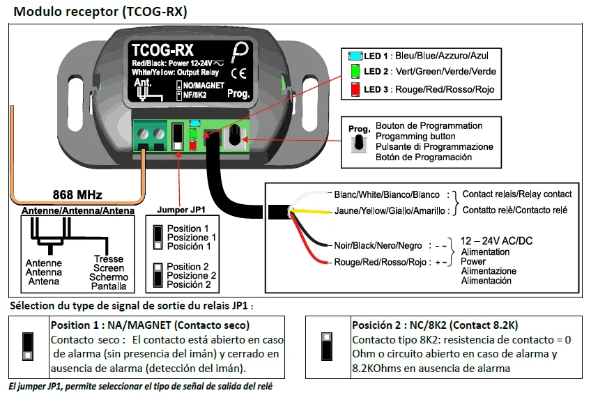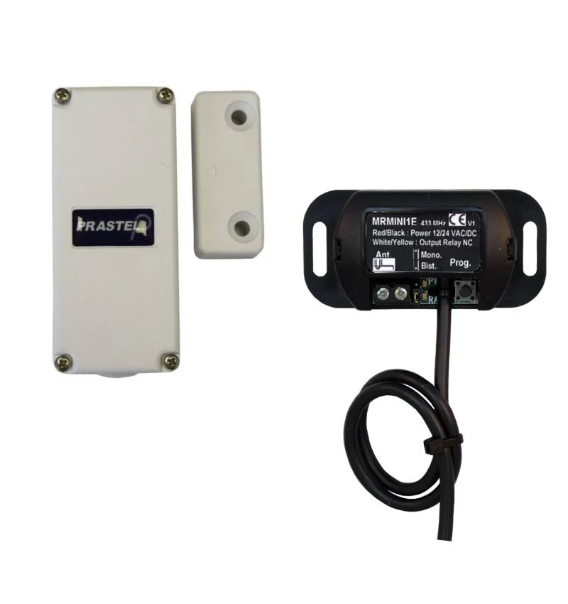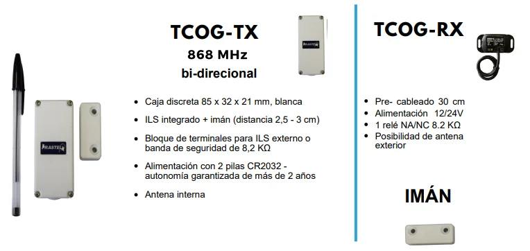 Está compuesto por un lector magnético con emisor via radio y un receptor, todo en frecuencia 868mhz para evitar interferencias de radio con otros dispositivos.