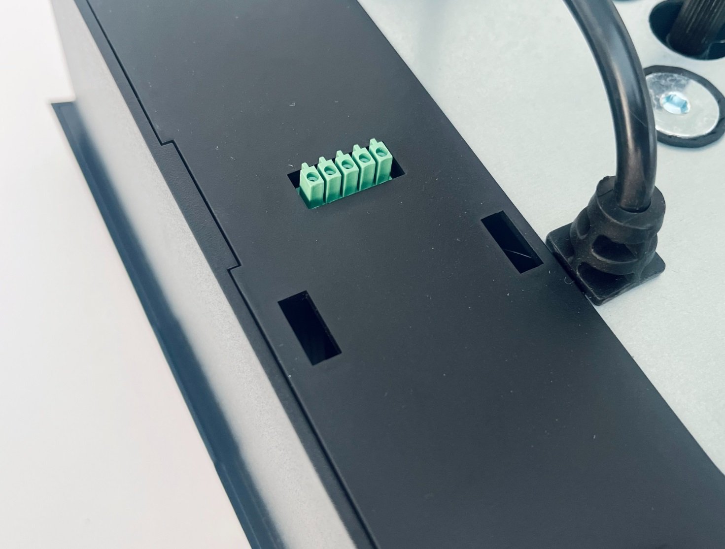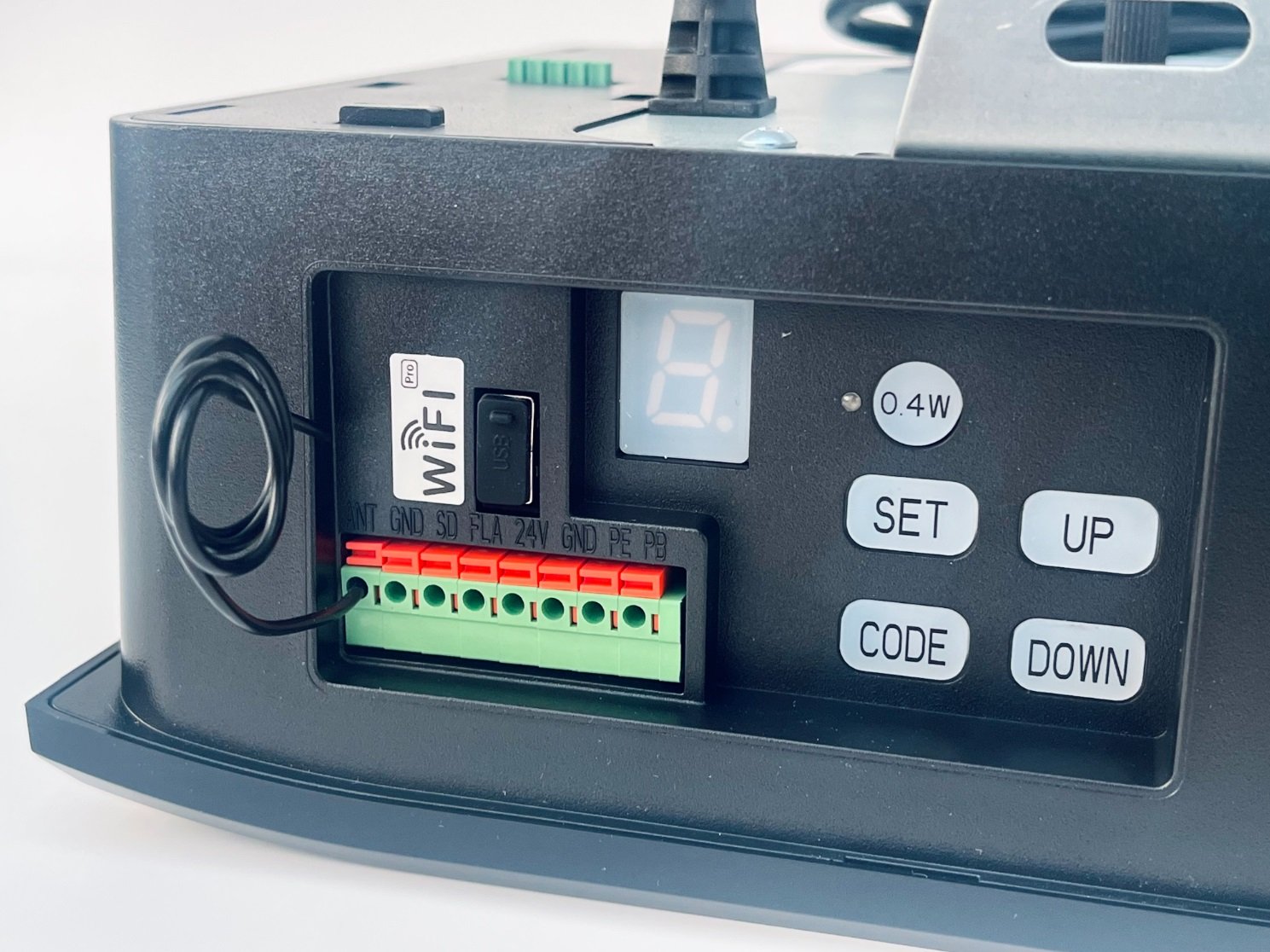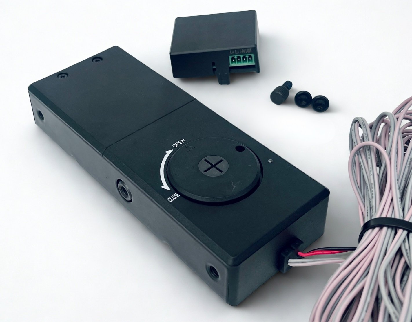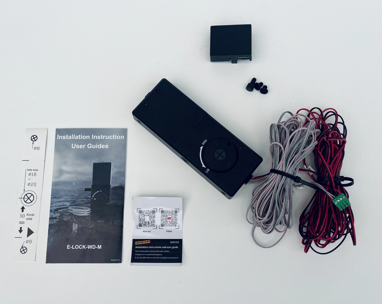 Consta de un módulo de relé para enchufar al motor en la parte superior, cables de conexión y electrocerradura.