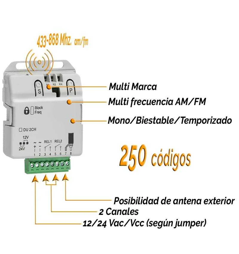 Radio receptor universal de 2 canales que permite memorizar en simultáneo mandos con código fijo, código rolling code Keeloq, tanto en frecuencia 433,92Mhz como en frecuencia 868,35Mhz.